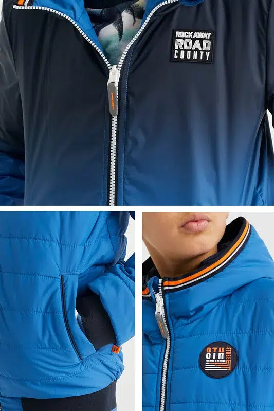 Dit bomberjack is niet alleen stijlvol met zijn kleurverloop van donker naar lichtblauw, maar ook uiterst praktisch dankzij de omkeerbare functie. De capuchon met oranje accent biedt extra bescherming op winderige dagen.