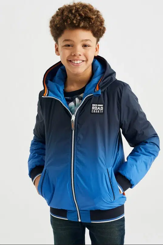 Ontdek het veelzijdige Jongens Reversible Bomberjack met capuchon, perfect voor elk seizoen. Met een uniek blauw kleurverloop en praktische steekzakken, ideaal voor dagelijks gebruik.