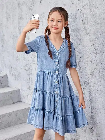 Ontdek de charme van de blauwe OnlyGirlzz meisjesjurk met een speelse denim uitstraling en comfortabele pasvorm, perfect voor elke gelegenheid.